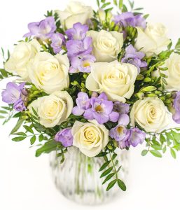 This bouquet of purple freesias, white roses, and lush foliage offers a stunning display without breaking the bank. Delivered in bud to extend their beauty, these flowers arrive in a secure, elegantly designed Eflorist box, setting the stage for a magical unboxing moment. With the simple addition of water and our nourishing flower food, the receiver will be greeted by radiant blooms within just two days. This bouquet will be delivered by courier with tracked delivery for peace of mind. Value without compromise.