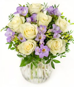 This bouquet of purple freesias, white roses, and lush foliage offers a stunning display without breaking the bank. Delivered in bud to extend their beauty, these flowers arrive in a secure, elegantly designed Eflorist box, setting the stage for a magical unboxing moment. With the simple addition of water and our nourishing flower food, the receiver will be greeted by radiant blooms within just two days. This bouquet will be delivered by courier with tracked delivery for peace of mind. Value without compromise.