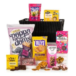 Our Proudly Vegan gift basket is packed with plant-based indulgence, from Angelic Cookies and Lazy Day Rocky Road to Ooh! Chocolata Vegan Chocolate, Howdah Poppadoms and Olly’s Olives. Beautifully presented in a black rope basket, it’s the perfect vegan-friendly gift for any occasion. This hamper contains 8 items: Angelic Double Chocolate Cookies 125g Angelic Multi Seed Savoury Biscuits 142g Howdah Tandoor BBQ Poppadom Minis 80g Lazy Day Rocky Road 150g Melting Pot Vegan Honeycomb Fudge 90g Olly’s Multi-Seed Sesame Pretzel Thins 35g Olly’s Olives Chilli and Rosemary Green Olives 50g Ooh! Chocolata Dairy Free & Vegan Honeycomb Milk Chocolate 50g Packed in a rope weave basket.