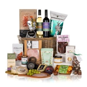 Treat someone special to the Spirit of Christmas Hamper-a festive celebration of gourmet flavours and seasonal luxury, presented in a stylish grey Kubu storage basket. This indulgent hamper begins with a trio of distinguished cheeses: Barber’s Farmhouse Cheddar, Ford Farm’s Wensleydale & Cranberry Truckle, and Gillot Camembert. Accompanied by Long Clawson’s Blue Stilton and The Cherry Tree Cheeseboard Chutney, they’re perfectly complemented by rosemary thins, crackers, and Kalamata olives for the ultimate savoury spread. Raise a toast with two bottles of Kintu wine-Cabernet Sauvignon and Sauvignon Blanc-ideal for pairing with Wessex Country Dorset Ham and Severn & Wye Smoked Salmon. This hamper contains 19 items: Joypouch Belgian Chocolate Apple Pie Cluster 100g Linden Lady Decorated Milk Chocolate Covered Marshmallows 115g Maxwell & Franks Christmas Pudding 350g Mr Filbert’s French Rosemary Almonds 100g Odysea Houmous 265g Popti Cornish Bakehouse Fragrant Rosemary Thins 120g Savoursmiths Desert Salt Potato Crisps 150g Silver & Green Aragostine Pistachio 150g Silver & Green Pitted Kalamata Olives 220g The Cherry Tree Cheeseboard Chutney 210g The Fine Cheese Co. Chive and Extra Virgin Olive Oil Crackers 125g Barber’s Farmhouse Mature Cheddar Truckle 200g Ford Farm Wensleydale with Cranberry Truckle 200g Gillot Camembert Le Petit Terroir 250g Long Clawson Blue Stilton 220g Severn & Wye Smoked Salmon 125g Wessex Country Gammon Dorset Cured Sliced Ham 200g Cabernet Sauvignon Kintu Chile 75cl 12.5% vol Sauvignon Blanc Kintu Chile 75cl 12.5% vol Packed in kubu storage basket.